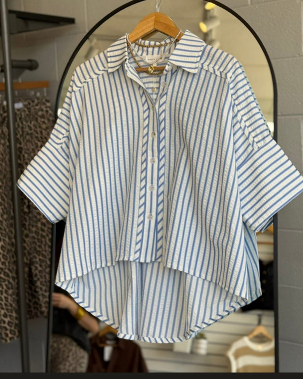 Coastal Breeze Stripe Ruffled Button -Down